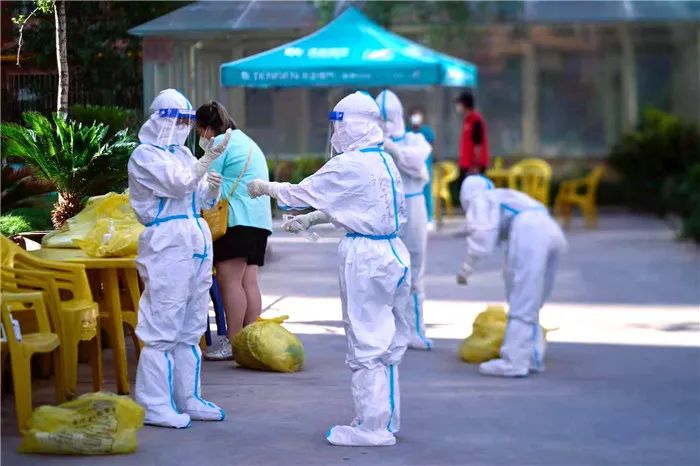 每天上午,全副武装的“大白”们两两一组,挨家挨户上门进行核酸采样。