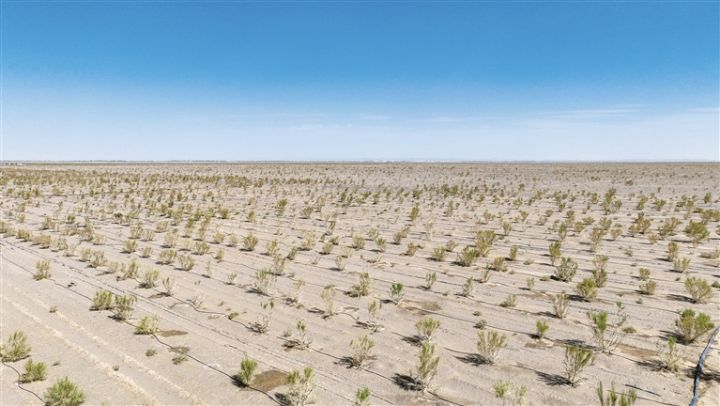 近期,在金塔县大漠农林生态产业股份公司万亩梭梭种植基地,工人进行浇水管护作业。连绵起伏的梭梭林犹如绿色长城,在巴丹吉林沙漠西缘筑起坚实生态屏障。