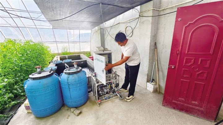 酒泉润欣农业农民专业合作社理事长李军国的温室蔬菜大棚里,饱满的番茄挂满藤蔓,长势喜人。令人惊讶的是,这里不见菜农忙碌的身影,取而代之的是各类智能传感器和自动化设备。