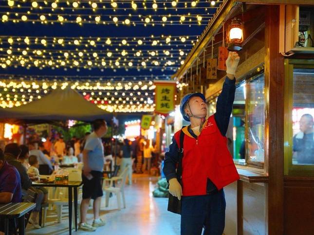 国网金塔县供电公司员工在辖区夜市检查并消除用电安全隐患,并为商户介绍安全用电注意事项。