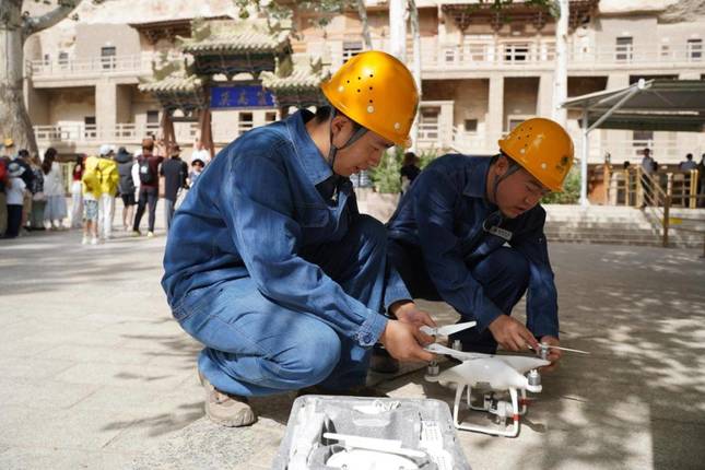 国网敦煌市供电公司工作人员在莫高窟景区对用电设施进行巡视检查,全力保障节日期间旅游景点可靠用电。