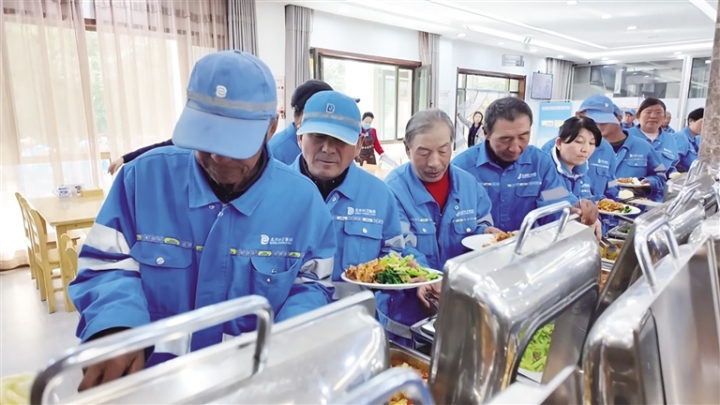 当日午餐时段,身着统一工作服的环卫工人有序步入食堂,自取餐食。现场提供的18道荤素菜品搭配合理,加上新鲜时令水果,营养丰富且口味地道。用餐过程中,环卫工人谈笑风生,对饭菜品质赞不绝口。