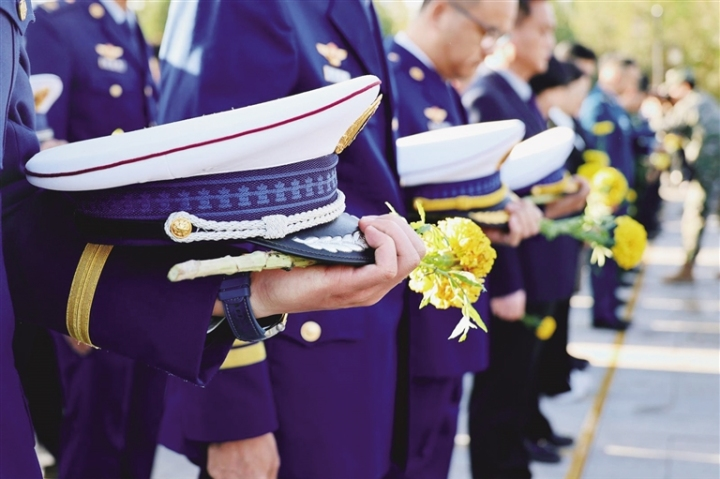 在缅怀英烈的队伍里,身着白色海军作训服的退役军人田新阳凝视着纪念碑的目光格外坚定。“作为一名退役军人,我将把对先辈的缅怀化作前进的力量,在岗位上恪尽职守。”田新阳说。