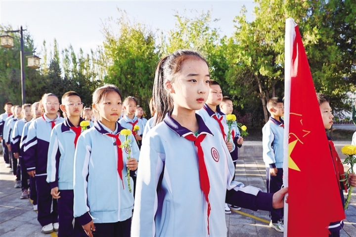 酒泉市第七中学的学生排着整齐的队伍,来到无名烈士墓碑前,郑重地行少先队队礼。“他们曾和我们一样年轻,选择为理想、为家国奉献一切。我们会把这份缅怀记在心里,化作读书的动力,努力学习知识、增长本领,将来用自己的力量建设祖国,不辜负先辈用热血换来的今天。”酒泉第七中学五年级学生马郑钰说。