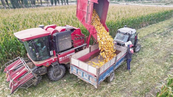 近日,在肃州区银达镇黑水沟村玉米地,农户抢抓晴好天气,用农业机械收割玉米,确保颗粒归仓。