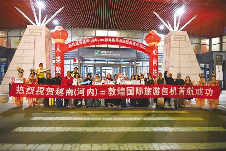 10月11日晚,由越南航空公司执飞的越南河内至中国敦煌国际旅游包机首航航班顺利降落敦煌莫高国际机场,标志着越南河内至中国敦煌国际旅游包机往返航线正式开通。