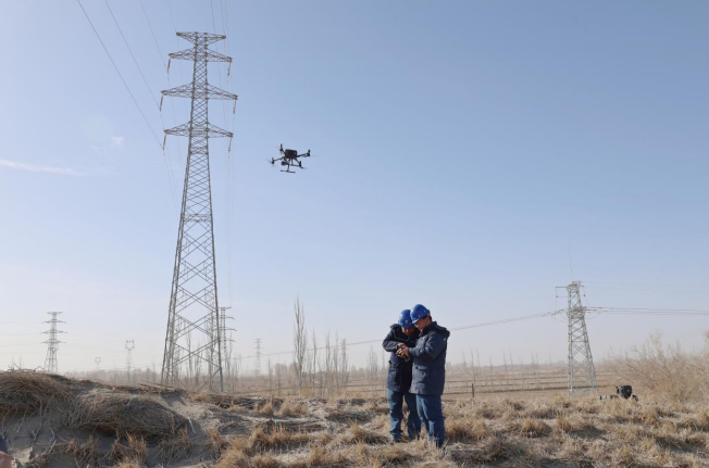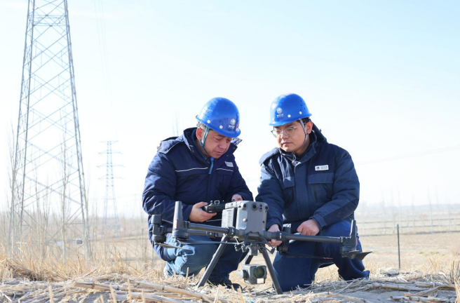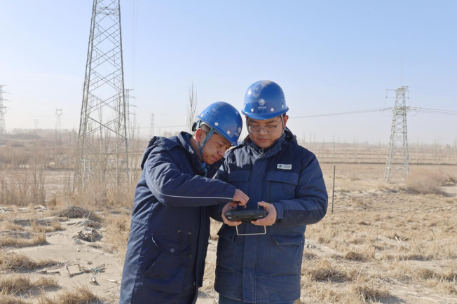 河西走廊的戈壁滩上,入冬后的第一场雪悄然而至。四野寂静,风雪初歇,铁塔银线在寒风中嗡鸣,输送着不竭电能。刺骨寒风卷起沙尘,令人难以久驻。然而不远处的铁塔下,一个蓝色工装的身影正稳稳操作遥控器,无人机桨叶在荒滩上划出阵阵旋风。他,就是国网酒泉供电公司东风输电线路运检班的90后输电巡线飞手李永涛。此刻,他正对胡河一二回线进行全覆盖巡检,以智能化手段为神舟二十二号飞船发射保电筑牢“双保险”。
