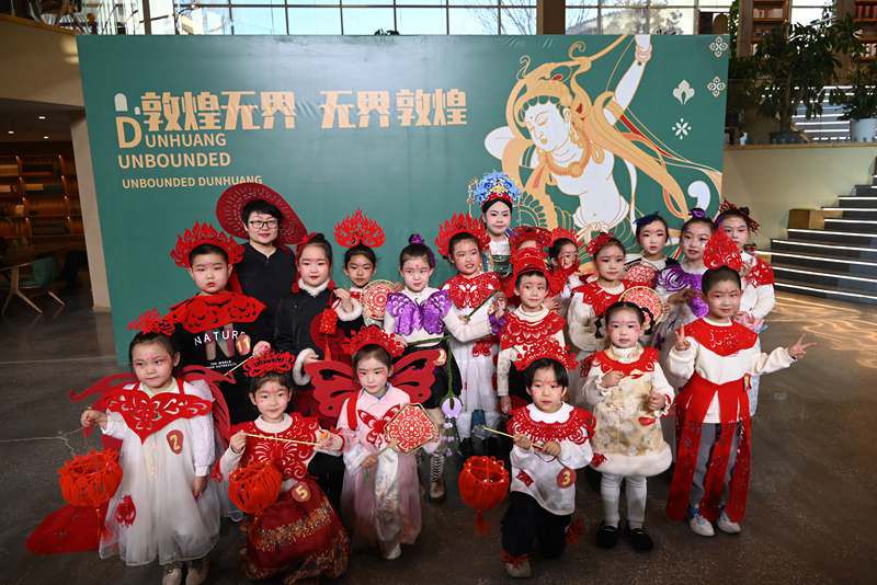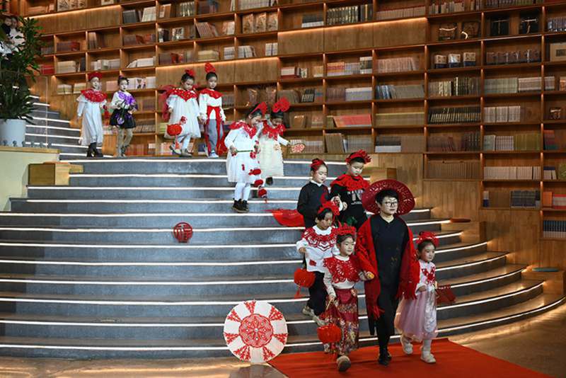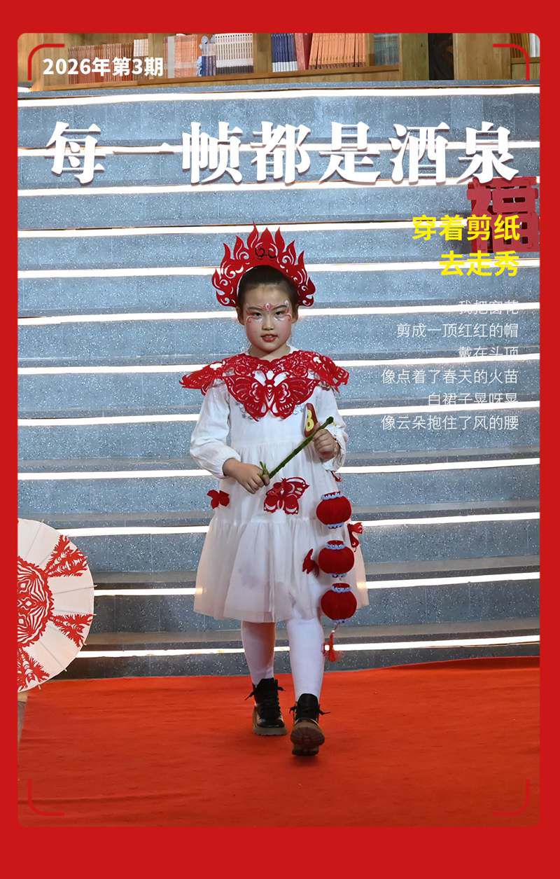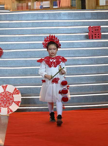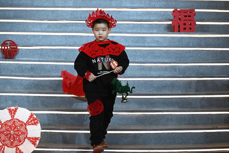 1月11日,在敦煌无界,10余名小朋友以走秀方式展示自己的剪纸服饰作品,尽显非遗魅力。(张晓亮 摄)